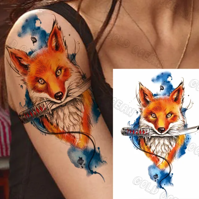 קנו קעקועים ואמנות גוף Geometric Watercolor Rose Flower Temporary Tattoos For Women Girls Fox Lotus Butterfly Fake Tattoo Sticker Sexy Leg Body Tatoos